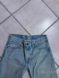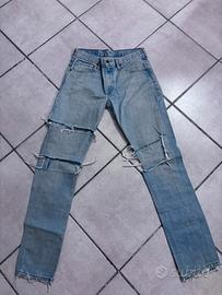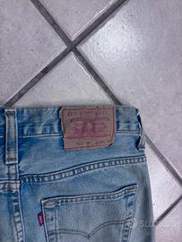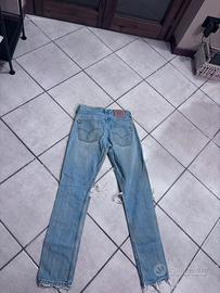 originale vintage. Il capo presenta un lavaggio chiaro (light wash) con uno splendido effetto vissuto naturale e personalizzazioni "distressed" (strappi sulle ginocchia e orlo a vivo) che gli conferiscono un carattere unico, perfetto per outfit streetwear o grunge. Caratteristiche principali: • Modello: Levi’s 507-04 (taglio dritto, leggermente bootcut o slim a seconda della vestibilità desiderata). • Taglia Etichetta: W29 L32 (corrisponde a una 42/43 italiana circa). • Colore: Denim chiaro vintage. • Dettagli: Red Tab Levi's presente, etichetta posteriore in pelle (Jacron) integra, tasca interna stampata con la storia del brand. • Condizioni: Ottime condizioni strutturali. Gli strappi sulle gambe e l'orlo sfilacciato sono parte del design custom del capo.
