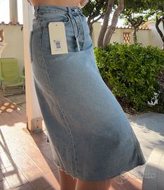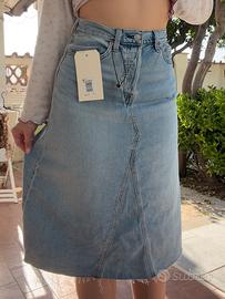 Gonna Decon ad "A" a Vita Alta di Levi's. Questa gonna in denim è progettata come un'alternativa ai classici jeans, offrendo uno stile versatile e femminile. Silhouette midi a trapezio (linea ad "A") che valorizza la figura. Vita alta comoda con il classico stile a 5 tasche di Levi's. Presenta un orlo sfrangiato "deconstructed" e una chiusura con zip. Realizzata in denim non elasticizzato. La tonalità mostrata è un lavaggio blu chiaro, denominato "Secret Secret". Taglia 27 (va bene su una S/M) Nuova con cartellino