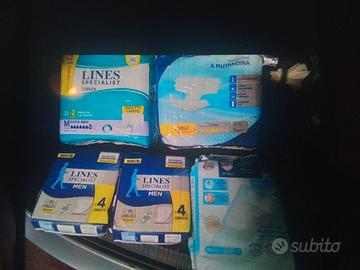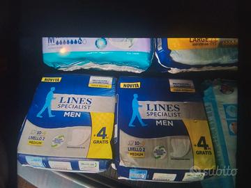 2 PACCHI LINES SPECIALIST MEN 10 + 4 LIVELLO 2 MEDIUM + 15 MUTANDINE GOFFISOR LARGE + PROTEC TRAVERSE SALVALETTO + LINES SPECIALIST UNISEX PANNOLONI A MUTANDINA VEDI FOTO. TUTTI IN BLOCCO EURO 20.00 VERO REGALO NON SPEDISCO