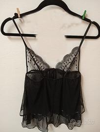 Baby doll nero in pizzo con tanga abbinato mai messo. Taglia II - Coppe in pizzo nero, parte sottostante in tulle morbidissimo. Mai messo.