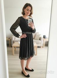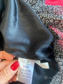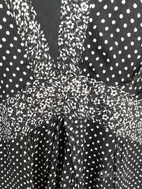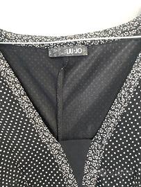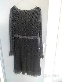 Elegante abito Liu Jo da donna in colore nero con fantasia a pois bianchi e dettagli a motivo floreale sullo scollo e sotto il seno. Realizzato in tessuto leggero , velato e fluido, effetto seta stropicciata. probabilmente poliestere, con fodera interna nera per garantire comfort e copertura. Vestibilità leggermente svasata, scollo a V e maniche lunghe con polsini arricciati e rifiniti a onde. Lunghezza sopra il ginocchio. Condizioni molto buone, senza segni evidenti di usura, strappi o macchie. Ideale per occasioni speciali, eventi serali o un look raffinato da tutti i giorni. Logo in strass, Taglia europea L , 48 italiana indicata per una vestibilità comoda e femminile.