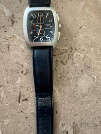 Vebdo iconico Locman Italy Sport (Ref. 487), un classico del design italiano anni '90/00. Cassa ultraleggera in alluminio a forma di tonneau, quadrante blu con numeri oversize e lancette arancioni. Cronografo al quarzo con datario. Cinturino originale in pelle blu. L’orologio è vissuto e presenta graffi su cassa e vetro che ne accentuano lo stile industrial/vintage (vedi foto). Un pezzo di storia dell’Isola d’Elba perfetto per amanti dello streetwear.