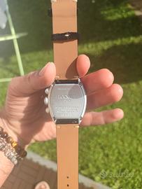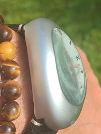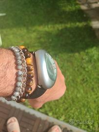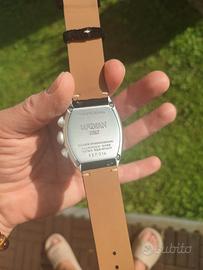 Marchio: LOCMANModello: Mai Anni di produzione: 2000/2009 - Movimento: di precisione controllato al quarzo Funzioni: ore, minuti, secondi, data Cassa: oviforme, oversize, interamente in allumini Ghiera: liscia Corona: originale liscia Pulsanti: a goccia Anse: curve; attacco 20mmDimensioni: 40 mm corona esclusa, 55 mm alle anse Vetro: minerale, con ancora adesa la pellicola protettiva originale Fondello: serrato da 4 viti e riportante il logo della casa e con ancora adesa la pellicola protettiva originale Quadrante: con indici arabi luminescenti, lancette a spada in acciaio, anch'esse luminescenti, secondi continui al 6, minuti del crono al 12, ore del crono al 9, secondi cronografici al centro, datario al 3 Cinturino: in pelle, originale rovinato+ cinturino nuovo in pelle scamosciata nero Chiusura: in alluminio, originale Locman Scatola originale in pelle e documenti