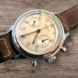 La cassa elegante in acciaio inossidabile con lunetta a gradini è ottimamente conservata. Considerando l’età ,le condizioni di questo orologio Longines sono semplicemente incredibili. La complicazione Flayback del calibro 30CH funziona perfettamente. Il cronografo può essere azzerato e avviato immediatamente con il pulsante inferiore.