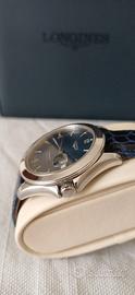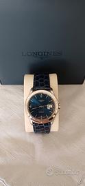 longines admiral 5 stelle, anni 2000 circa, cassa in acciaio da 38mm, movimento automatico con fermo macchina per regolare l'ora, scatto rapido data, ben funzionante, corona a vite originale, cinturino in pelle blue generico, fibbia con logo, introvabile quadrante blue soleil con logo,stelle,indici,numeri arabi applicati, punti e lancette luminescenti, piccola sbeccatura fra il 3 e il 4, il vetro zaffiro è stato sostituito con questo che ha la lente sulla data, fondello a vite con scritta e logo in rilievo, con scatola longines, in buone condizioni generali