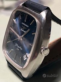 spettacolare e rarissimo longines ref.1110 Admiral flagship HF (calibro ad alta frequenza di oscillazioni) orologio degli anni 70 introvabile in condizioni NOS (solo un piccolo segno da esposizione sulla carrure ad ore 10 visibile in foto) , l'esemplare in questione ha cassa acciaio di forma lucida e satinata misura attuale da 38x34 con pellicola adesiva tonda di casa madre per proteggere dai graffi bellissimo quadrante originale blue cobalto soleil con finissima lavorazione corteccia, tipica della longines in quegli anni con indice bacchetta e sfere bastone corona logata, calibro automatico di manifattura 431 HF (36000 h/o)con binario a cremagliera per la più stabile sorrevolezza della massa oscillante (brevetto longines) pezzo di difficilissima reperibilità, prodotto nei primi anni 70 per pochissimo tempo, referenza 1110, di elevato interesse a livello collezionistico sicuramente un ottimo investimento