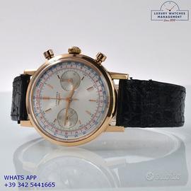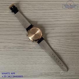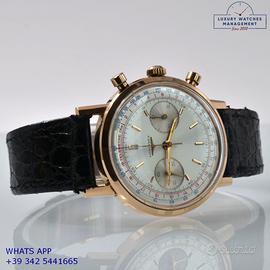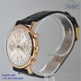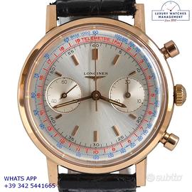 Longines Cronografo Fly-Back 7415 oro rosa 18KT, anno di produzione 1972, vetro plastica bombato, quadrante cronografo bicolore argento soleil con doppia scala tachi-telemetrica, movimento meccanico a carica manuale, cinturino in coccodrillo lucido colore nero con fibbia dorata originale Longines.