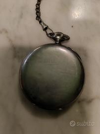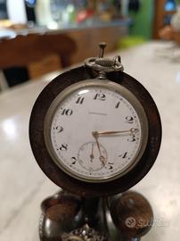 cipolla Longines con catena in argento e piedistallo in legno rivestito di pelle marrone da sempre insieme alla cipolla ma di cui non conosco la provenienza. l'orologio si carica ma è da revisionare.