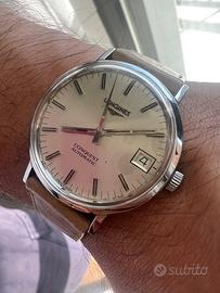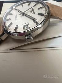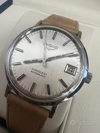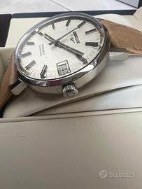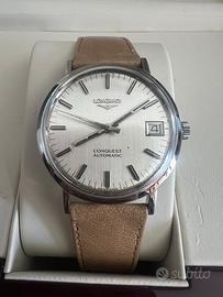 Longines Conquest Automatic vintage, quadrante silver sunburst con indici applicati, in ottime condizioni generali. Ref 1570 Diametro 35mm senza corona Cassa in acciaio ben conservata con normali segni del tempo, vetro plexi bombato coerente con l’epoca. Movimento automatico Longines funzionante e preciso. Quadrante originale con bella patina uniforme. Corona firmata Longines. Fondello originale con referenza visibile. Cinturino in pelle nuovo (non originale). Venduto con scatola non originale e porta orologio.