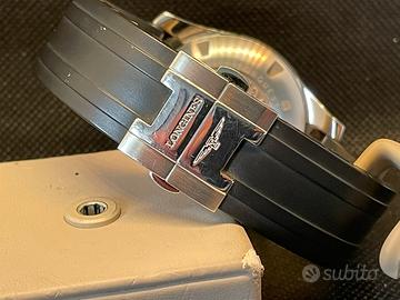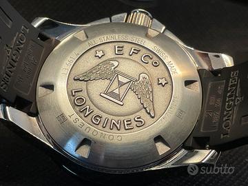 Vendo orologio marca Longines modello Conquest Chronograph, referenza L3.661.4, cronografo meccanico a carica automatica, cassa in acciaio da 41mm con ghiera in ceramica nera, sub 300mt, cinturino originale in caucciù mai messo a misura con deployante originale.