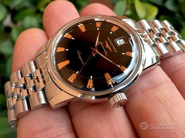Cassa in acciaio da 35 x 42 millimetri ad esclusione della corona di carica,dial e sfere originali in splendide condizioni,datario ad ore 12 ok,fondello a vite,corona doppio scatto ok,movimento originale longines cal.L633 a carica automatica perfettamente funzionante e con ottima tenuta del tempo e riserva di carica,bracciale originale doppia deployante per polsi fino a 18 cm.