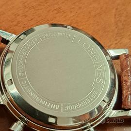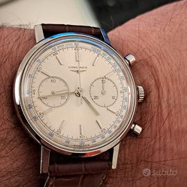Stupendo cronografo Longines del '64 ,con estratto cronologico di archivio, ref.7413 ,cassa acciaio diametro 38mm, fondello a vite e pulsanti a pompa, completamente originale e coevo nei particolari. Monta uno dei calibri cronografici più apprezzati e riconosciuti a livello qualitativo nel collezionismo, il famoso 30ch, recentemente revisionato. Le condizioni sono rare e impeccabili . Orologio di unico proprietario, indossato pochi anni. Prezzo leggermente trattabile.