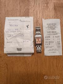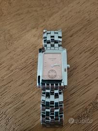 Vendo Longines dolce vita ref L5.655.4.96.6 al quarzo , orologio da donna usato ma in condizioni ottime per gli anni che ha, è stato acquistato nel 1998 ma rimane un pezzo iconico e di gran classe, ha uno stupendo quadrante color salmone, cassa e bracciale sono in acciaio inox con chiusura deployante a doppio bloccaggio, l'orologio è completamente originale verrà venduto con tutte le sue maglie più libretto di certificazione e relativa carta longines, la scatola negli anni si è distrutta quindi verrà sostituita con un box da viaggio molto pratico e funzionale, l'orologio si può vedere e provare senza impegno, è appena stata fatta revisione il 24/01/26 dove è stata cambiata la batteria, cambiato il circuito elettrico e effettuata lubrificazione delle parti meccaniche tutto dimostrato da ricevuta, le foto sono parte integrante nella vendita e rispecchiano la reale condizione dell'orologio.
