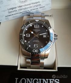 Longines Hydroconquest Ref. L3.781.4.76.6 - Ø 41.00 mm Nuova versione con spirale in silicio Caratteristiche: MATERIALE: Acciaio inossidabile e lunetta in ceramica VETRO: Zaffiro con trattamento antiriflesso multistrato su entrambi i lati DIAL: con lavorazione "a raggiera" grigio CALIBRO: L.888 FONDELLO: Fondello avvitato DIMENSIONI: Ø 41.00 mm DISTANZA TRA LE ANSE: 21 mm LUG to LUG: 50,8 mm SPESSORE: 11.90 mm IMPERMEABILITÀ: Impermeabile fino a 30 bar CARATTERISTICHE: Corona a vite, Lunetta girevole unidirezionale PESO: 185.7 g MOVIMENTO: Automatico CALIBRO L888 (no oris) DESCRIZIONE DEL MOVIMENTO: Movimento meccanico a carica automatica con frequenza di 25'200 alternanze orarie e riserva di carica di circa 72 ore FUNZIONE: Ore, minuti, secondi e data ESCLUSIVO CALIBRO DI MANIFATTURA LONGINES FIBBIA: Con chiusura déployante a doppia sicurezza e estensione sub integrata Accetto eventuali scambi con rado citizen seiko tag heuer oris bulova hamilton e certina. Graditi anche eberhard doxa baltic mido tudor breitling omega tissot oris Il celebre marchio orologiero svizzero Longines, con sede a Saint-Imier dal 1832, vanta una lunga tradizione caratterizzata dall’eleganza dei suoi prodotti e delle loro prestazioni.