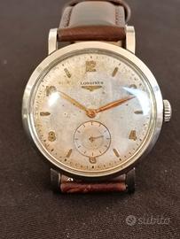 Propongo un Longines jumbo dei primi anni 50, da 37 mm, quadrante con bella patina uniforme, classica disposizione degli indici arabi e a cuneo. Movimento a carica manuale e buono stato di conservazione generale.