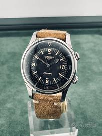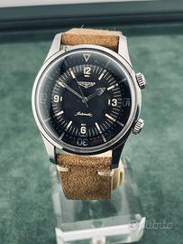 Bellissimo Longines Legend Diver ref. 7042-3 risalente al 1960 circa con cassa in acciaio da 42mm, vetro plastica bombato, quadrante nero tropicale con indici e sfere al trizio originali, movimento meccanico a carica automatica Longines cal. 19AS, cinturino in pelle colore havana, con fibbia in acciaio originale Longines d’epoca.