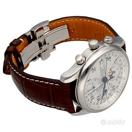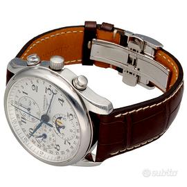 Longines Master Collection Moonphase referenza L2.673.4.78.3 con cassa in acciaio e quadrante argento con numeri arabi, caratterizzato da calendario completo, cronografo e indicazione delle fasi lunari. Modello elegante e molto apprezzato della collezione Master, completo di corredo originale.