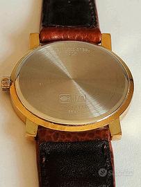 Design elegante e minimale con cassa placcata oro, quadrante color champagne, indici dorati e datario ad ore 12. Cinturino originale in pelle marrone testurizzata, molto raffinato e confortevole. Movimento al quarzo di precisione ETA svizzera.