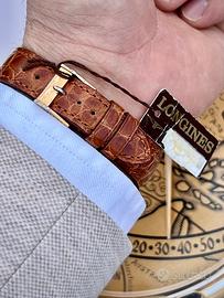 In vendita per realizzo immediato splendido Longines Diamond Dial anni '60, un pezzo di rara eleganza e sostanza tecnica. CARATTERISTICHE PRINCIPALI: Movimento: Prestigioso calibro di manifattura Longines 19.4 a carica manuale. Un movimento ultra-sottile, celebre per la sua robustezza e precisione, in ottime condizioni di marcia. Quadrante: Originale "Silver Sunburst" con splendida spazzolatura verticale. Gli indici alle ore 12, 3, 6 e 9 sono impreziositi da 4 diamanti autentici incastonati in castoni a stella/rombo, tipici dei modelli di lusso per il mercato americano. Cassa: In 10k Gold Filled (laminatura in oro 10 carati), molto più resistente e pregiata della normale placcatura. Condizioni estetiche eccellenti, nessuna perdita di metallo evidente. Cinturino: Originale Longines, montato su pregiata pelle di coccodrillo color cognac che ne esalta il calore dell'oro. Questo non è un Longines comune. La combinazione tra il movimento 19.4 e il quadrante con diamanti lo rende un pezzo da collezione molto ricercato.