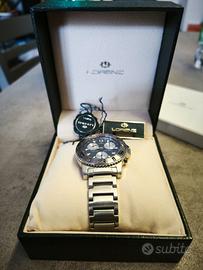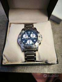 Cronografo al quarzo con movimento svizzero, datario a ore 4, ghiera girevole unidirezionale, vetro zaffiro, corona serrata a vite, fondello serrato a vite, bracciale in acciaio con chiusura con libretto di sicurezza. Disponibile consegna a mano.