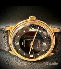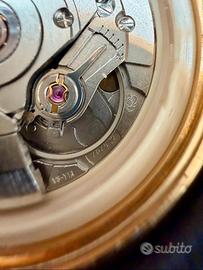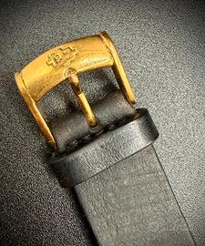Vendo orologio perfettamente funzionante con movimento automatico calibro eta 2824. La cassa placcata in oro 20 micron misura 38mm esclusa corona logata, quadrante nero bitono, datario ad ore 6. Cinturino in pelle artigianale con fibbia originale logata. Orologio originale in tutte le sue parti Completo di scatola ma senza documenti. non spedisco, solo consegna a mano.