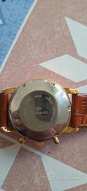 Cronografo automatico Lorenz usato. La cassa è in acciaio placcato oro, montato su un cinturino in pelle marrone con stampa coccodrillo. Il cinturino ha un normale segno di usura come da foto.