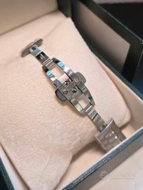 Orologio Lorenz Montenapoleone day-date con cassa e bracciale in acciaio con finitura lucido/satinata e quadrante colore avorio. Ref. 24720. Vetro zaffiro, bracciale in acciaio con chiusura a farfalla personalizzata con logo Lorenz e pulsanti di sicurezza. Indicatori del giorno della settimana a ore 6 e della data a ore 3. Fondo monoblocco, e corona a vite marchiata Lorenz. Movimento al quarzo. Completo di scatola originale e maglie del bracciale, attualmente per polsi sottili. Ottime condizioni, presenti piccoli graffi superficiali visibili in controluce per cui necessiterebbe di una lucidatura per splendere come nuovo.
