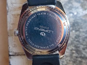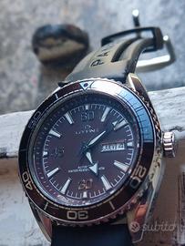 Orologio Lorenz Sub automatico, appena revisionato, in condizioni estetiche non bellissime ( presenti segni su ghiera e vetro) . Cassa in acciaio inox 43 mm, cinturino in gomma non originale in discreto stato, ghiera girevole unidirezionale, movimento automatico Miyota 21 jewels appena revisionato e sostituito guarnizioni , water resistent 10 ATM. Vendo con formula visto e piaciuto e conseguente esclusione di garanzia ad euro 50,00 non uso tuttosubito solo consegna a mano zona Pavia no altre modalità di transazione grazie. Acquisto orologi Seiko subacquei automatici usati ottima valutazione pagamento immediato.