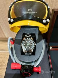 LORENZ SPECIAL EDITION TAKO 030254HH Orologio con movimento automatico Seiko NH35. Cassa in acciaio diametro 43 mm. Spessore cassa 14 mm. Fondo in acciaio serrato a vite con massa oscillante a vista colorata. Vetro zaffiro. Ghiera girevole unidirezionale in ceramica nera e grigia. Quadrante nero/verde. Cinturino in acciaio con chiusura deployante, larghezza cinturino 21 cm. Datario giorno del mese a ore 3 con lente. Water Resistant 10 Atm. Prezzo di listino Euro 349
