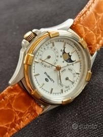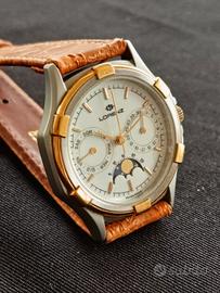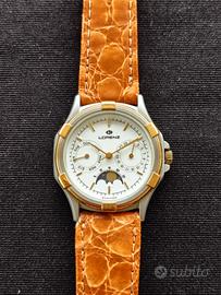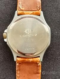 Propongo un classico dell'orologeria, storico marchio Lorenz con cronografo con doppio datario e fasi lunari. Movimento al quarzo e funzionalità, stile e discrezione per questo orologio. Cassa acciaio e oro placcato da 35 mm. Corona originale a pressione. Cavalieri dorati sulla lunetta. Quadrante bianco con indici e lancette a bastone. Contatori del giorno del mese e della settimana e fasi lunari. Movimento al quarzo originale. Vetro minerale in ottime condizioni. Cinturino e fibbia nuovi generici. SI VENDE IL SOLO OROLOGIO NO SCATOLA NO DOCUMENTI L'orologio funziona correttamente e tiene bene il tempo anche se non si conosce la data dell'ultima revisione. Le foto sono parte integrante della descrizione, non si accettano resi. Segui il mio profilo ho sempre un assortimento di Longines, Omega, Tag Heuer, Tudor Zenith e altri orologi vintage tank e diver