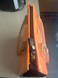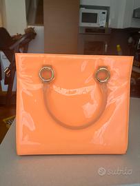 Borsa da donna, nuova mai utilizzata, in pelle lucida color corallo, con tasche interne.