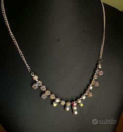 Vendo splendida coppia di collane girocollo vintage, autentici pezzi di bigiotteria americana/europea della metà del '900. Ideali per collezionisti, amanti del vintage o per dare un tocco di luce a un outfit da cerimonia. Descrizione dei pezzi: 1. Girocollo Smeraldo e Aurora Boreale (Stile Marquise): raffinata collana con castoni color argento. Presenta grandi strass a taglio navette verde smeraldo, circondati da una corona di piccoli cristalli "Aurora Boreale" dai riflessi cangianti. Design classico ed elegante, tipico degli anni '50. 2. Girocollo Rivière Multicolore: collana luminosa con pendenti a scalare in cristallo Aurora Boreale. I riflessi variano dal rosa all'azzurro fino all'oro, con una pietra centrale più grande nei toni del fucsia/rubino. Montatura in lega dorata con chiusura a gancio regolabile. Stato: Ottime condizioni vintage. Tutti i cristalli sono presenti e luminosi. Stile: Vintage / Old Hollywood / Retro. Ideale per: Collezionismo, matrimoni, shooting fotografici o eventi speciali.