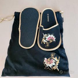 1 pantofole in cotone colore nero, con stampa e profili in raso color oro.