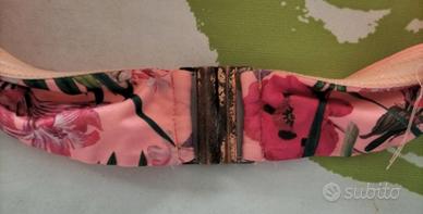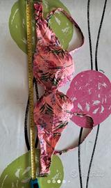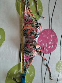 Bikini rosa con stampa a fiori: coppa con ferretto, slip normali. Reggiseno con spalline regolabili, chiusura ossidata come in ultima foto, per il resto il costume è in ottime condizioni.