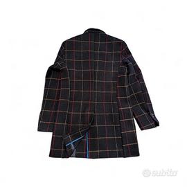 Modello 1: Cappotto scuro a trama check (quadri) con profili color ocra e amaranto. Taglia 46.