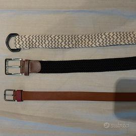 Lotto 3 cinture uomo, ottime per uso quotidiano. Beige/bianca: Intrecciata, fibbia ad anello argento scuro, 100cm. Mai usata. Nera: Intrecciata elastica, fibbia in metallo silver con passante in cuoio, 111cm. Mai usata. Marrone: Similpelle, fibbia rettangolare silver, 112cm. Usata pochissimo. Spedisco in 24h lavorative esclusi festivi, spedizione tracciata.