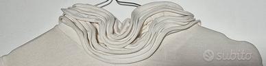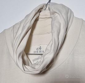 Bellissimo lotto di 3 maglie a manica lunga, ideali per un look casual o sport-chic (yoga/tempo libero). Tessuti morbidi e ottima vestibilità. DEHA Blu Notte / Viola: Maglia a dolcevita morbido con ampia fascia elastica in vita e logo ricamato. DEHA Panna: Elegante scollo ad anello e polsini risvoltati. Maglia Panna (Altro Brand): Raffinato collo alto con lavorazione a rouches sovrapposte e chiusura posteriore con bottoni. Brand: 2 capi DEHA + 1 capo senza brand specifico. Taglia: S/M. Colori: Blu notte/Viola e Panna. Usate in buone condizioni generali.