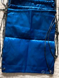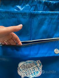 Lotto di 7 sacche zaino in nylon blu con coulisse, misura 34×44 cm. Leggere, pratiche e resistenti, ideali per sport, scuola, viaggi o tempo libero. Logo "I Viaggi di Kilroy". Le sacche hanno zip frontale e passacavo.