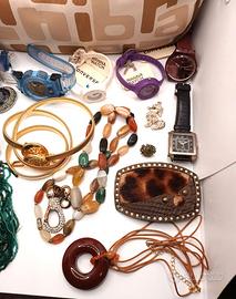 lotto bijoux vintage anni 70/80, 25 pezzi in totale e comunque quello visibile in foto, in particolare: 1 borsa BRACCIALINI ottime condizioni---10 orologi sia usati che mai indossati, tutti da testare per il funzionamento non assicurato, marchi presenti SWATCH, AQUA, CONVERSE, FILA, PAUL BRASS, LORELEIX, ETC.---3 fibbie per cintura metallo e strass made in italy,---4 oggettini in metallo e strass e perle----coppia di orecchini strass e pietre blu marca VANITY HER,----orecchino singolo strass e pietra,----2 cinture in metallo ,1 dorata con teste di leone, l'altra con strass e fiocco,---- 1 collana in pietre naturali di vario tipo---1 collana multifilo con pietre naturali ironstone----1 collana micro perline in vetro nei toni del verde---. tutti gli oggetti sono in buone condizioni alcuni con difetti ed imperfezioni, spedizione tracciabile.