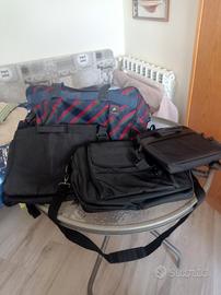 Lotto di un borsone grande ed ampio della Samsonite. Integro ma molto usato. Le chiusure lampo sono integre. Mancano i cursori di quella che serve per rimpicciolire. Un porta PC grande è in ottime condizioni. Un altro porta PC grande è molto usato, in condizioni accettabili. Il porta PC piccolo è in ottime condizioni. Il porta fotocamera è in ottime condizioni. Tutto hanno la tracolla.