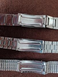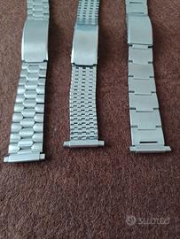 Lotto di Tre bracciali con anse mobili vintage di produzione anni 70' 80', si possono vendere anche separatamente. Tre diversi stili da abbinare al tuo orologio, uno ha maglie tipo NSA, uno armadillo ed uno tipo Seiko. Risultano particolarmente utili per quegli orologi che hanno le anse a scomparsa come Squale 2002, Tissot Navigator. Abbinabili ad orologi sportivi sia diver che cronografi come Monnin, Heuer, Breitling.