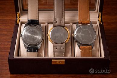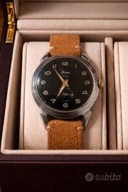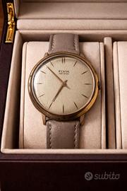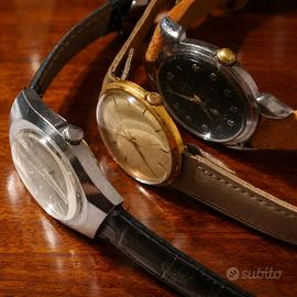 Lotto di 3 Orologi Vintage – Besançon Automatico, Elvia Ruby Shock, Herma Small Seconds – Anni ’60/’70 – Funzionanti Descrizione Interessante lotto composto da 3 orologi vintage risalenti agli anni ’60–’70, tutti funzionanti e con caratteristiche differenti, ideali per collezionisti o appassionati. 1)Besançon – Automatico con Data (circa 37 mm) Orologio automatico con datario a ore 3. Quadrante di grande fascino in verde oliva, con riflessi caldi tendenti al dorato che cambiano con la luce. Indicazioni “Antichoc” e “Antimagnetic”. Cassa in acciaio con segni del tempo, vetro in plexiglass con leggere abrasioni. Cinturino in pelle (non originale). 2) Elvia – Ruby Shock (circa 31 mm) Elegante orologio a carica manuale con cassa placcata oro. Quadrante avorio/beige con particolare texture leggermente craquelé, molto raffinato e ricercato. Indici e lancette dorate sottili. Cinturino in pelle. Condizioni coerenti con l’età. 3) Herma – Small Seconds (circa 40 mm) Orologio a carica manuale con secondi piccoli a ore 6. Quadrante nero con numeri arabi e lancette dorate, dal forte contrasto e ottima leggibilità. Cassa in acciaio con segni di utilizzo. Cinturino in pelle stile vintage. Dimensione generosa (circa 40 mm), rara per l’epoca. Condizioni generali Gli orologi sono funzionanti ma non testati nel lungo periodo né revisionati recentemente. Presentano segni di utilizzo coerenti con l’età