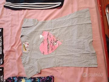 Lotto di abbigliamento per bambina, taglia 11-12 anni. Adidas, Desigual, originale marins - Due top sportivi con stampa Never Too Late. - Pantaloncini sportivi coordinati. - T-shirt grigia con cuore di paillettes. - Pantaloncini Adidas neri. - Maglietta rosa con dettagli sulle maniche.