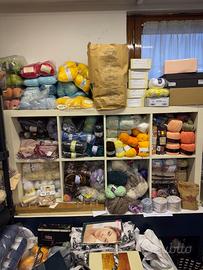 Disponibili diversi sacchi e scaffali di gomitoli come da foto.