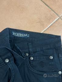 Lotto di tre paia di jeans firmati Jeckerson. - Un paio di jeans neri. - Un paio di jeans a righe grigie e bianche. - Un paio di jeans verdi. taglia S