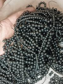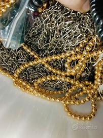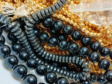 Include 72 bustine di perline miste (vetro, acrilico, qualche pietra dura e legno), circa 950 g di perle nere effetto ematite, catene metalliche e varie perline/componenti dorati.