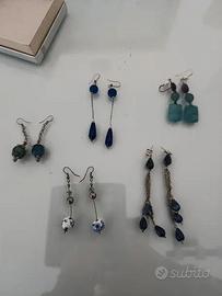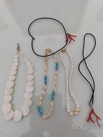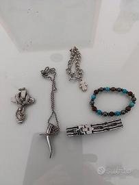 Lotto stock bigiotteria collane, orecchini, anello - donna e uomo. Il lotto comprende: - dieci collane - quella verde e quella di perle artificiali grigie e bianche sono vintage; la più grande delle due con i rametti di corallo ha una diramazione spezzata, le atre sono praticamente nuove - cinque paia di orecchini - usati ma in buone condizioni - un anello con una pietra marrone regolabile - condizioni accettabili Bigiotteria uomo - tre bracciali (uno in metallo, uno in acciaio - marchio all'interno - e uno in perline); un ciondolo a forma di croce avvolta da un serpente e una croce in metallo (alla catenella manca il gancetto). Usati ma in buone condizioni.
