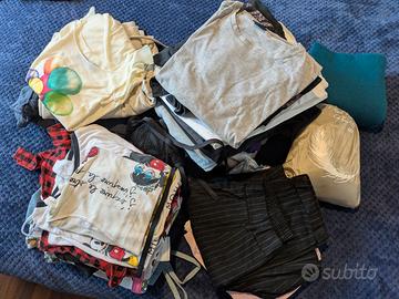 Lotto di vestiti vari da ragazza/donna taglia piccola, con maglie a maniche lunghe e corte, pantaloni, felpe, vestiti estivi. NO CALZE NO INTIMO NO SCARPE.