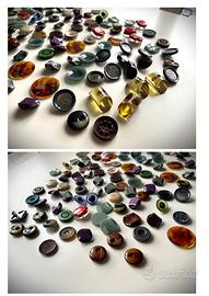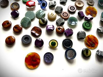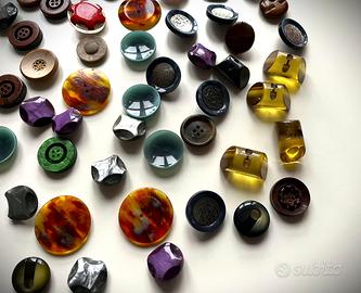 Pezzi unici tra cui spiccano marmorizzati "tartarugati", bottoni sfaccettati color ametista, bachelite verde smeraldo e spettacolari bottoni rossi con base trasparente.