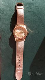 Elegante orologio da polso da uomo con cassa e cinturino color oro. Il quadrante presenta dettagli luminosi e indici applicati.